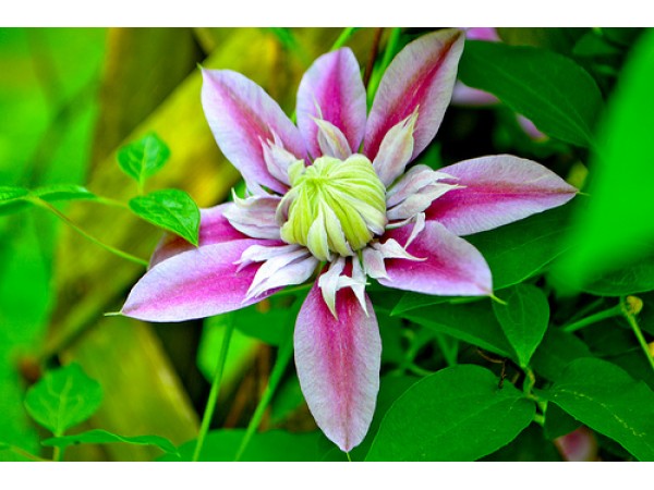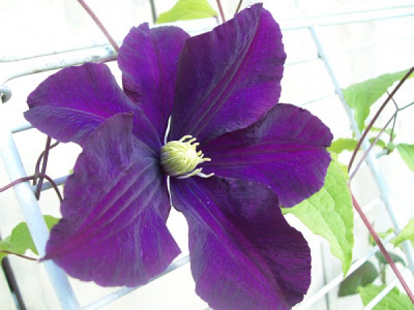 Liană volubilă, de talie mică-mijlocie. Frunze trifoliate. Flori mari, mov, apar în mai-iunie.