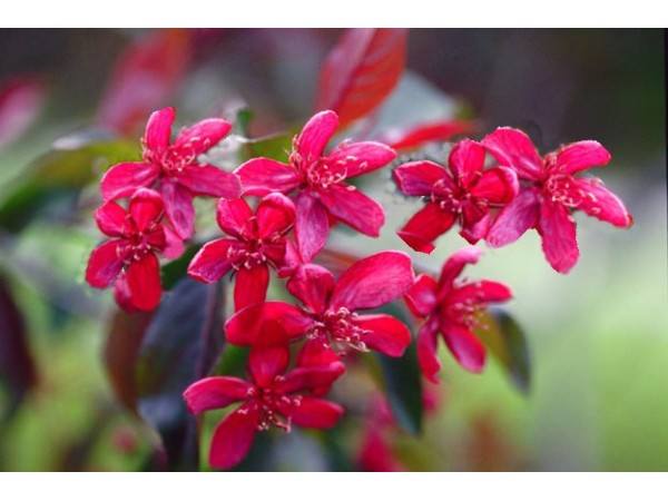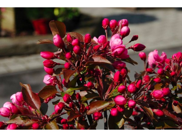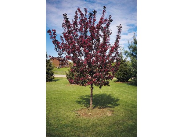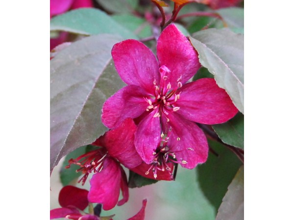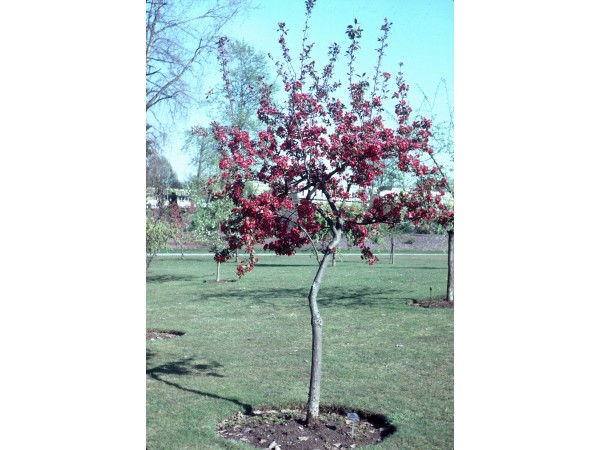 Arbore de talia III. Frunze roşii primăvara, apoi verzi. Flori roşii, apar în aprilie. Fructe mici, roşii, necomestibile.